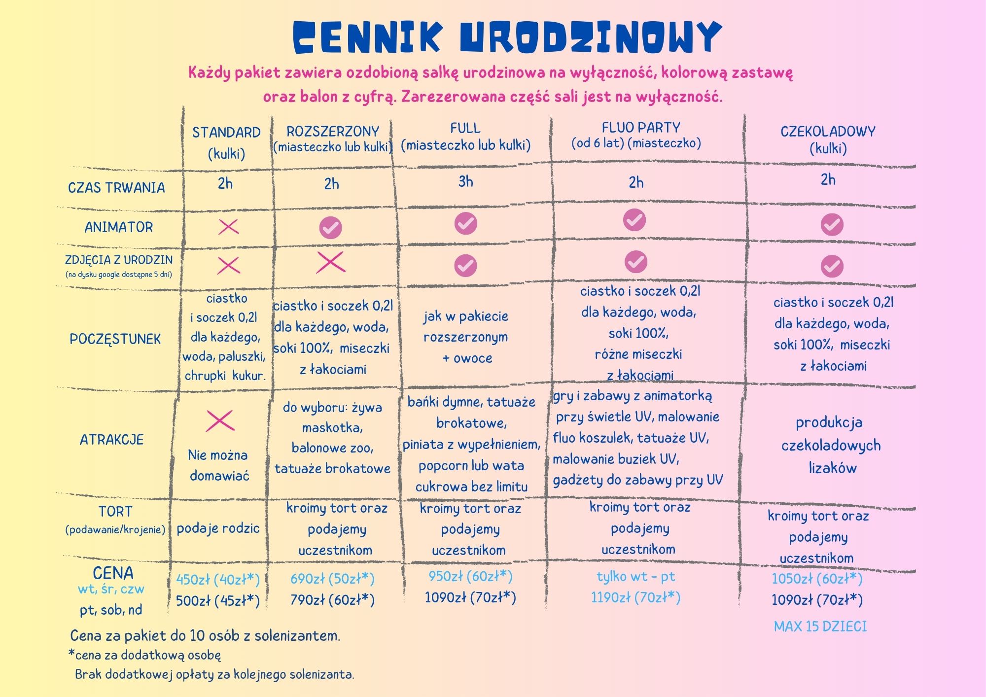 Wszystkie urodziny są w wybranej części sali (część z kulkami lub mini miasteczko) na wyłączność (bez kientów indywidualnych).